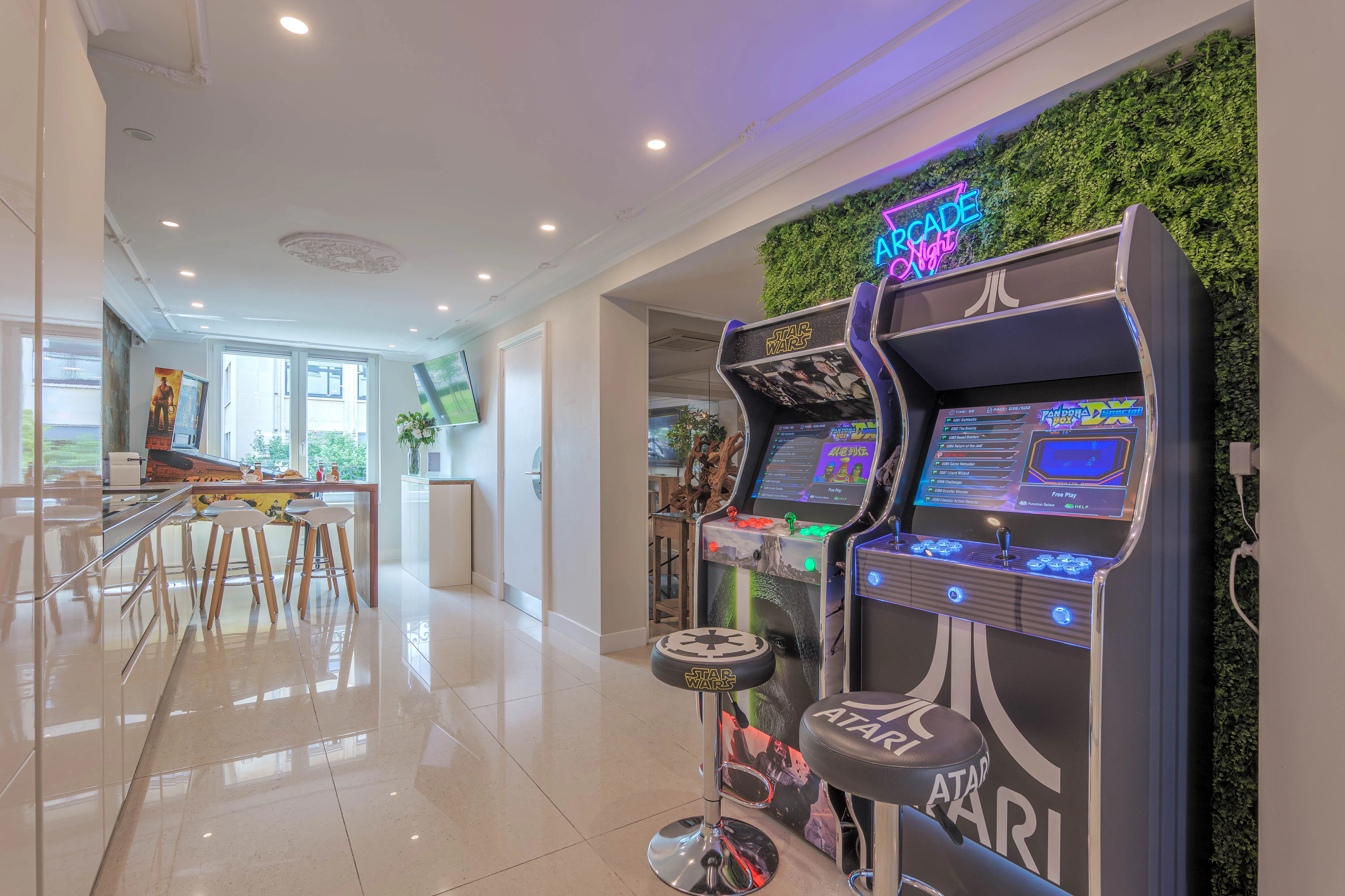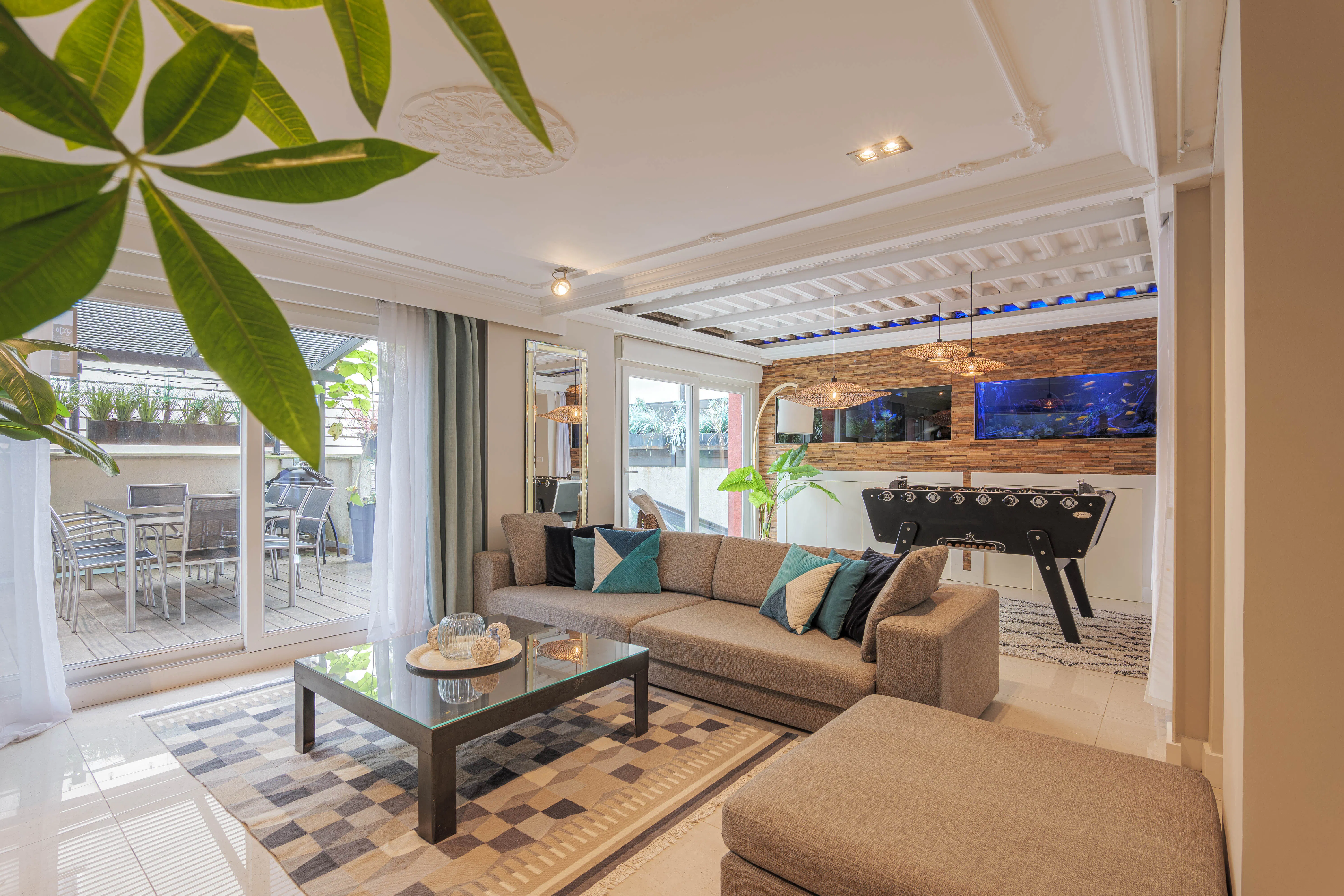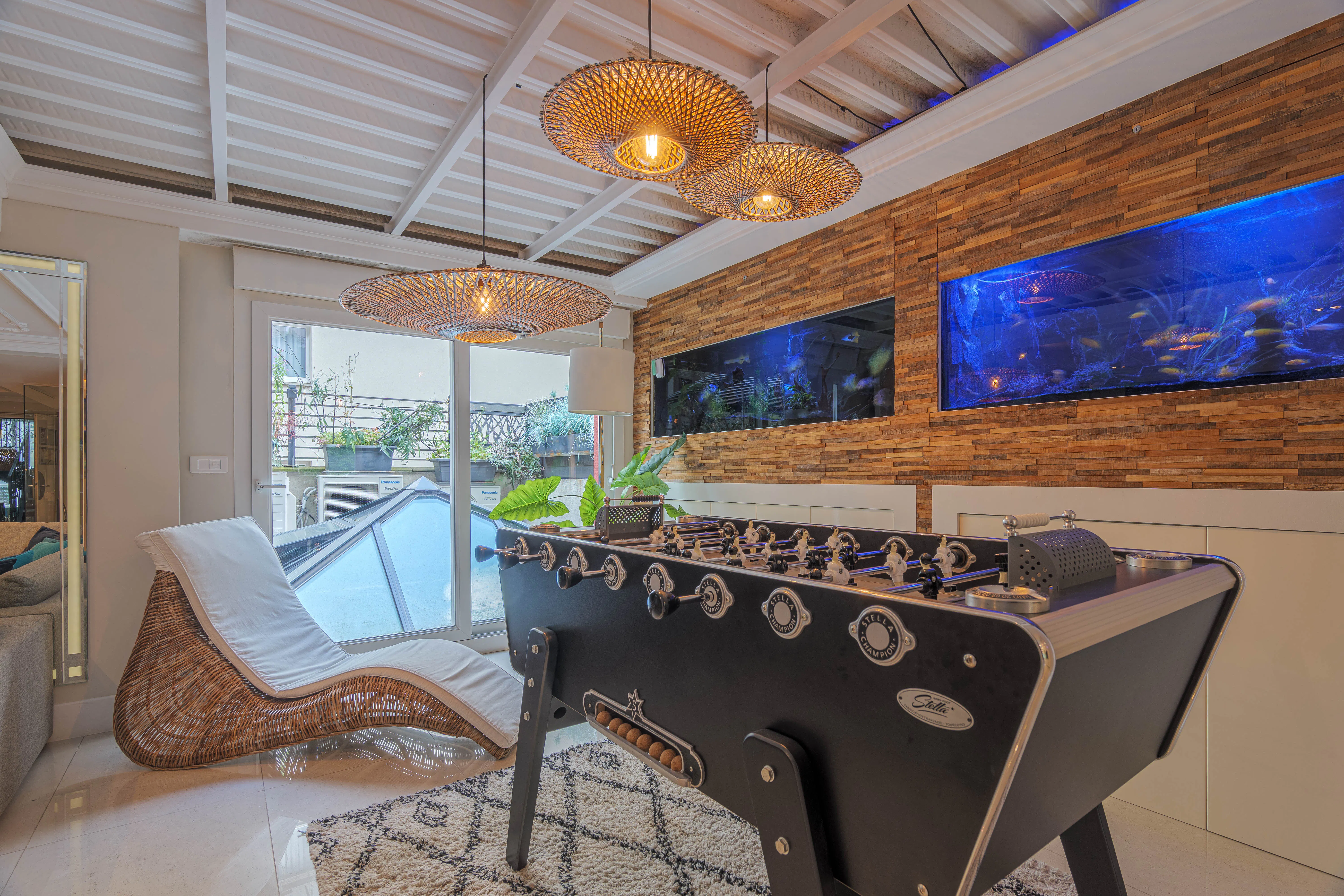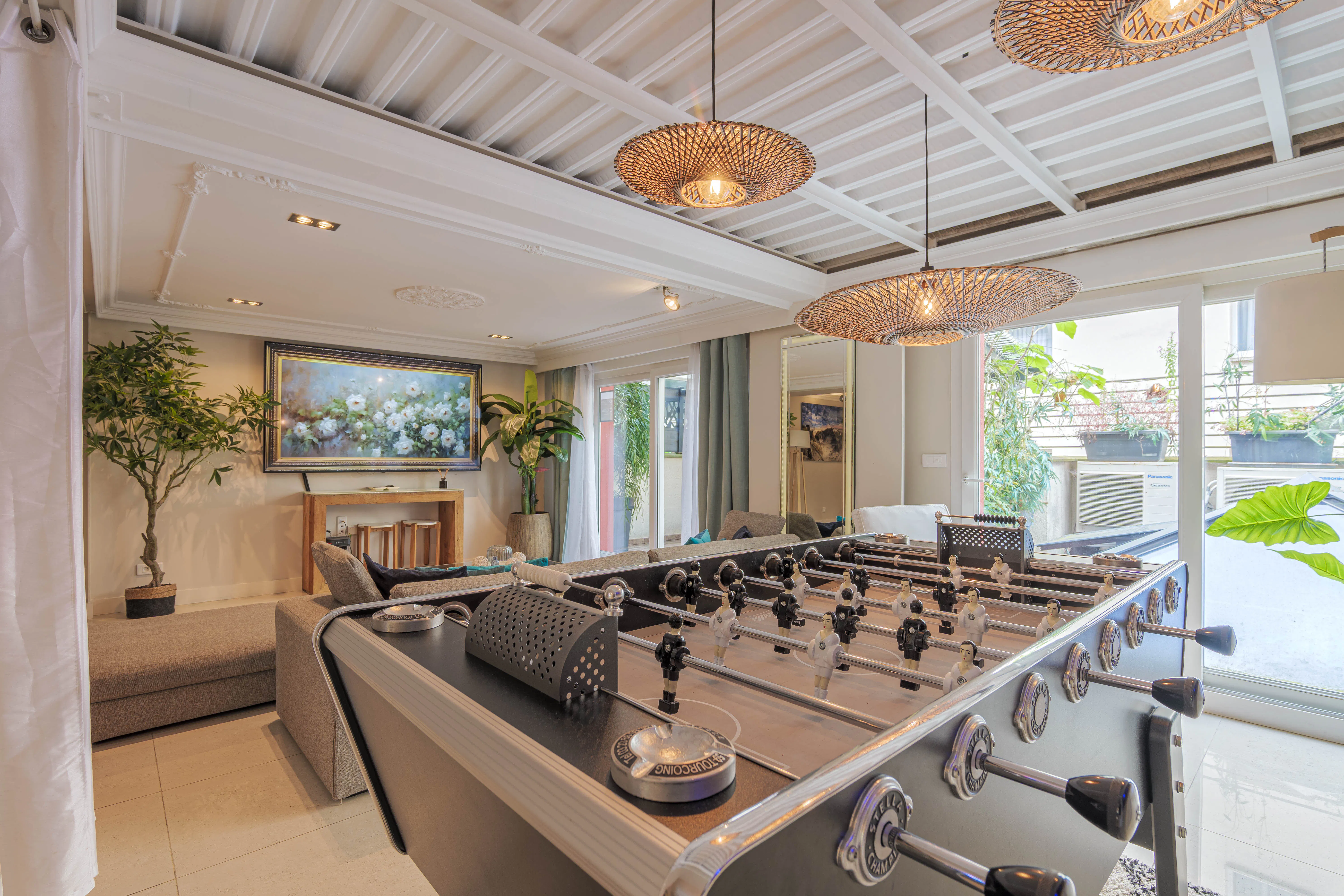 Fall in love with this superb 210 m² inverted triplex apartment offering an extraordinary living environment. The entrance to this apartment is on the first floor: you'll discover a large open-plan living area of 90 m² comprising a fully equipped kitchen, a living room, and a lounge with a very large flat-screen TV. For the enjoyment of both children and adults, this floor offers two arcade machines, a pinball machine, a Stella foosball table, and two large aquariums. You can also enjoy a 20 m² terrace.
