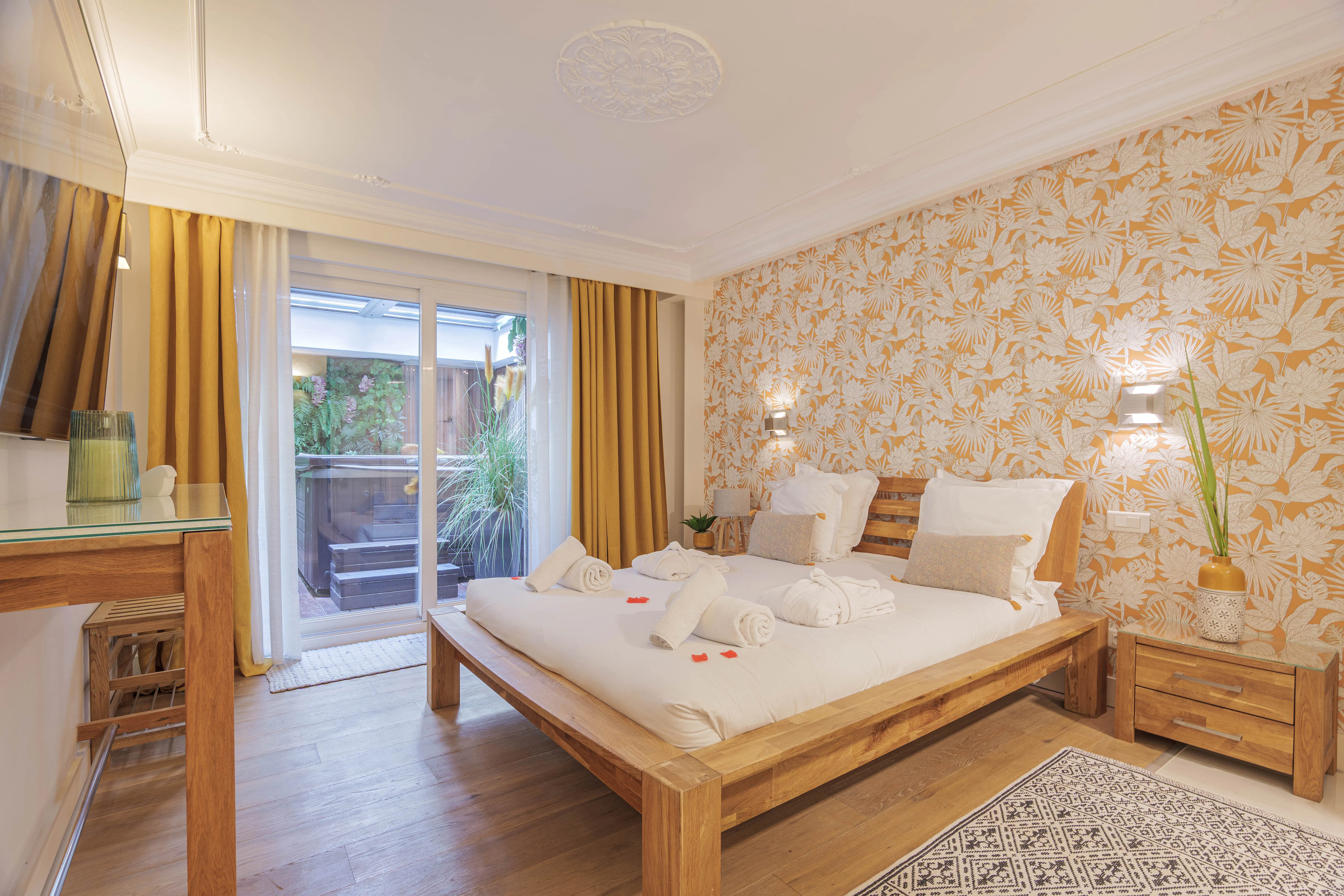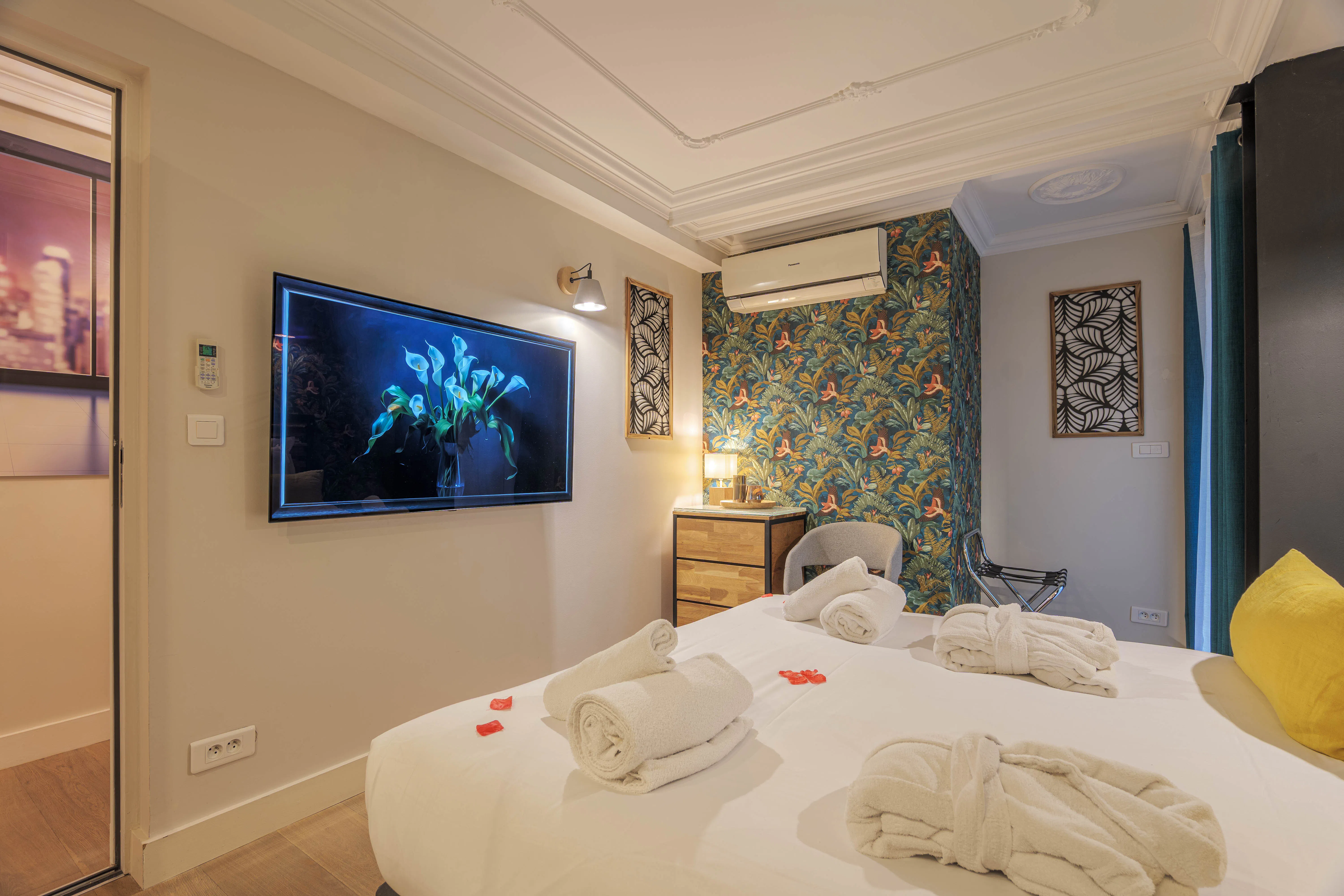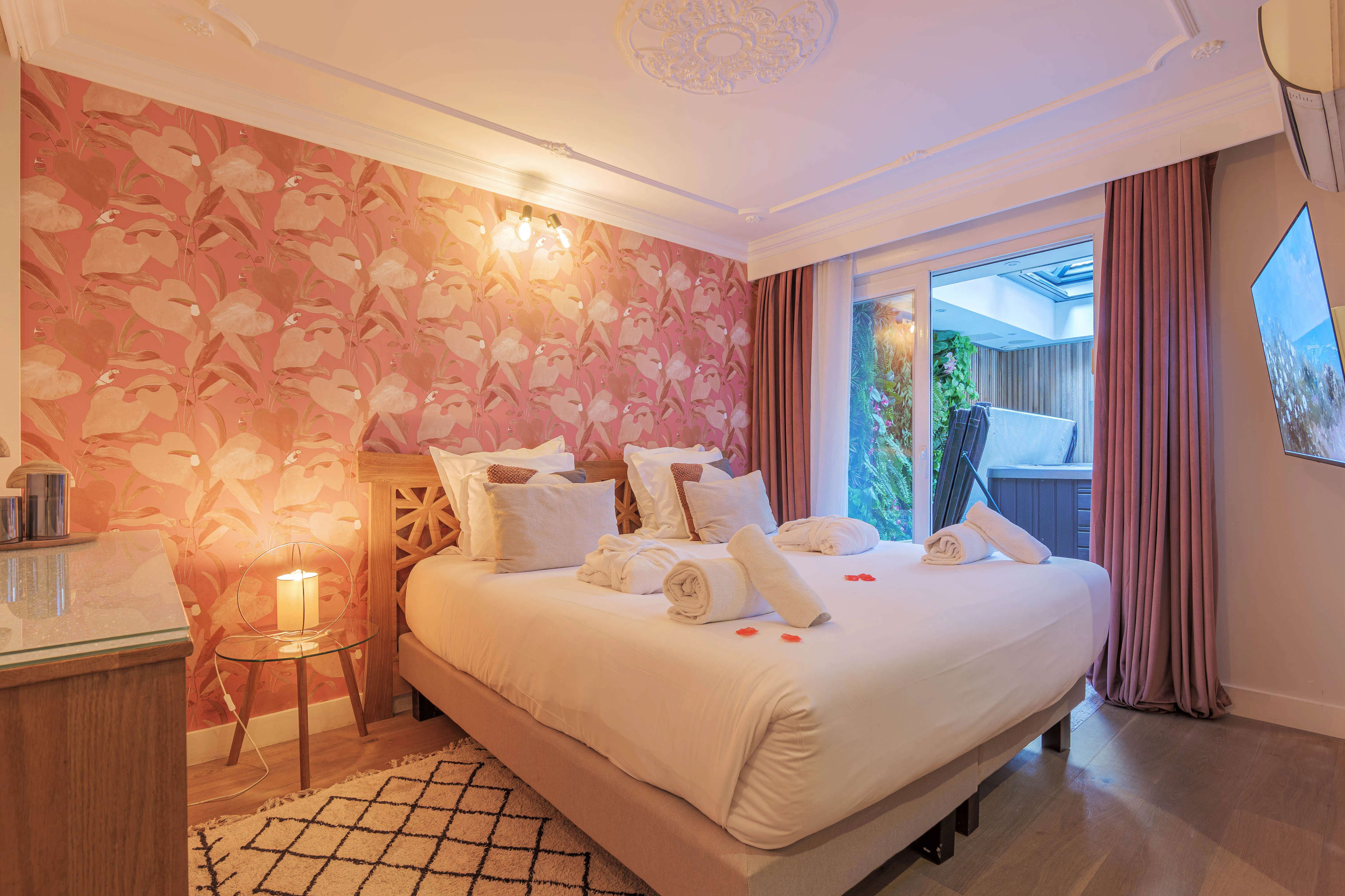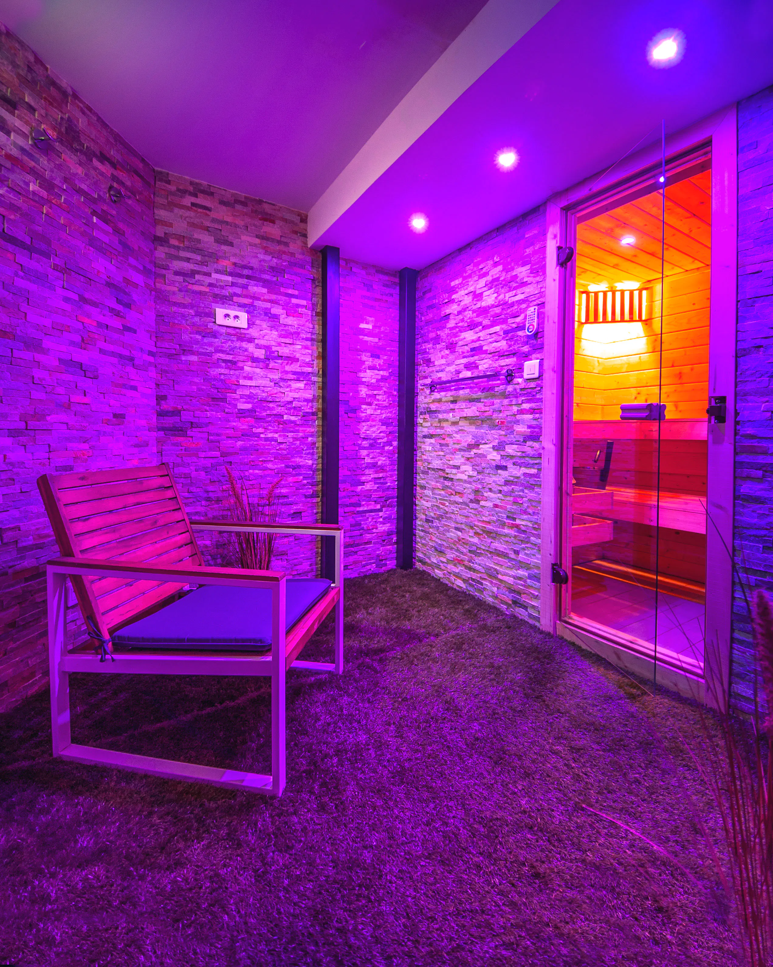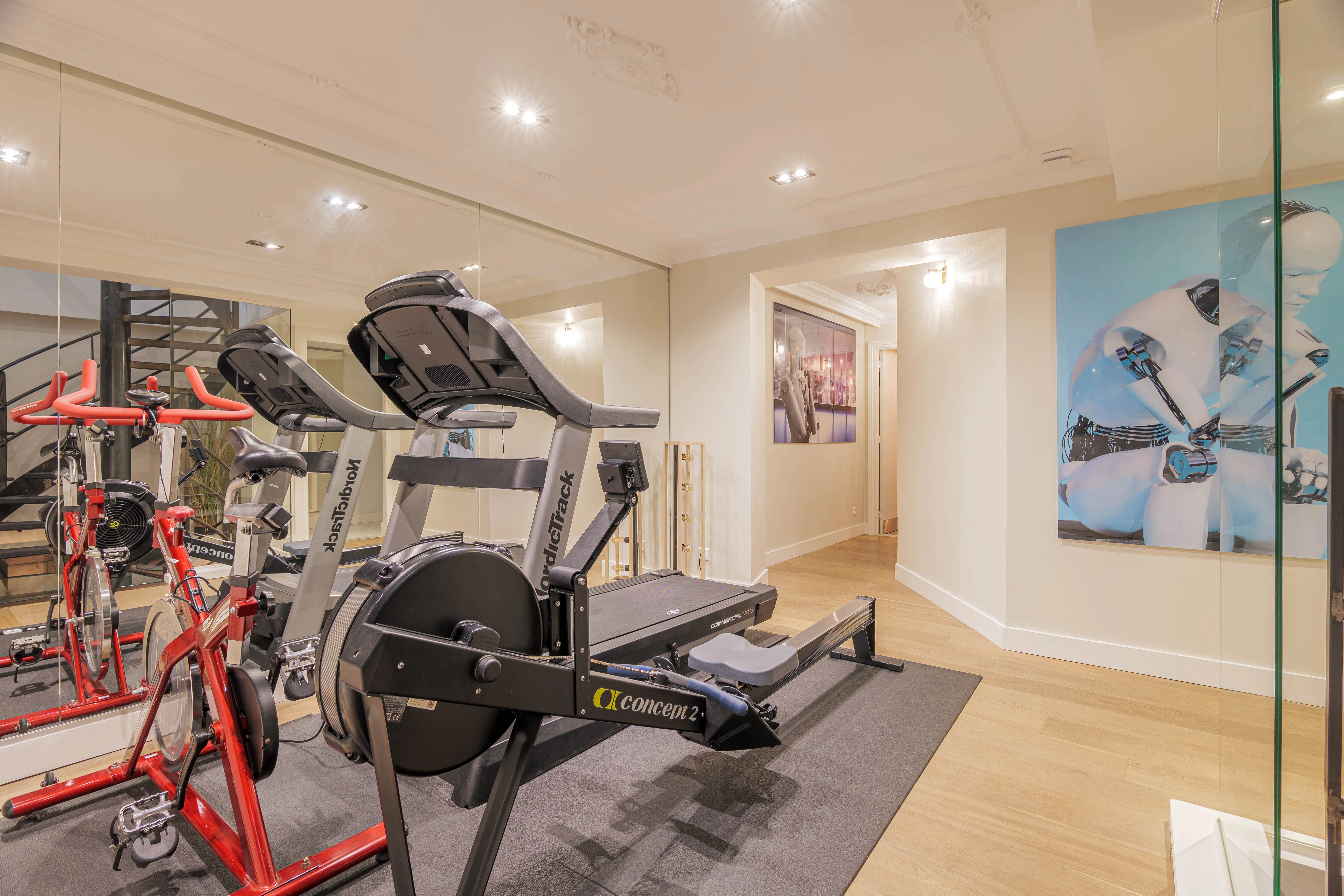 On the ground floor, the three bedrooms are equipped with a flat-screen TV, a double bed with quality linens, a walk-in shower, reversible air conditioning, and access to a professional 6-person jacuzzi. A fitness area is also at your disposal, with a treadmill, rowing machine, and exercise bike.